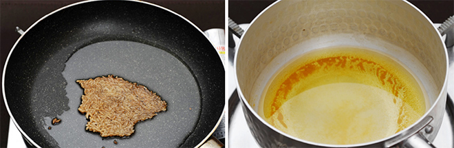 ⑤ 누룽지는 170℃의 온도 튀김 기름에 튀겨내고, 튀김옷 입힌 새우도 튀겨낸다.